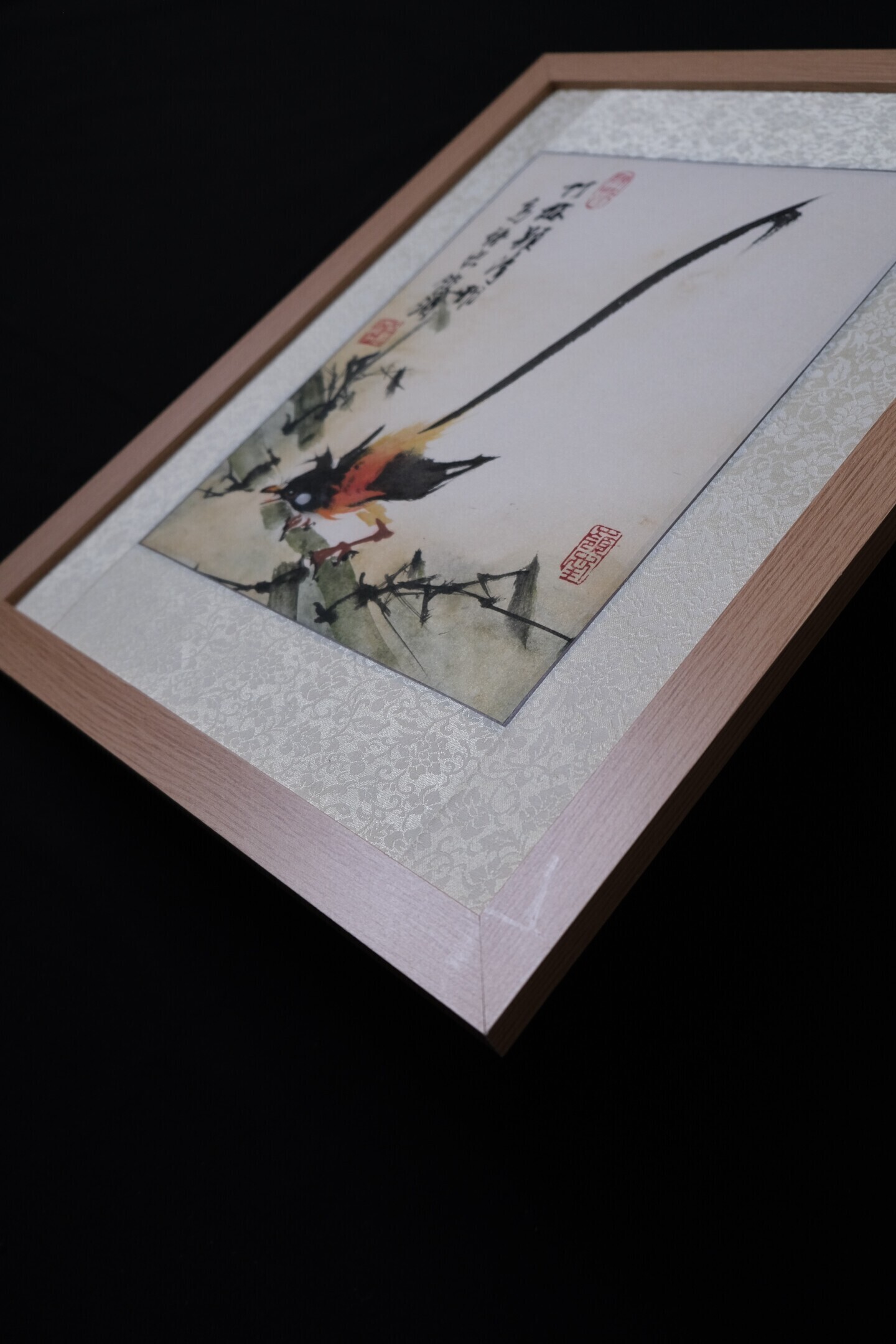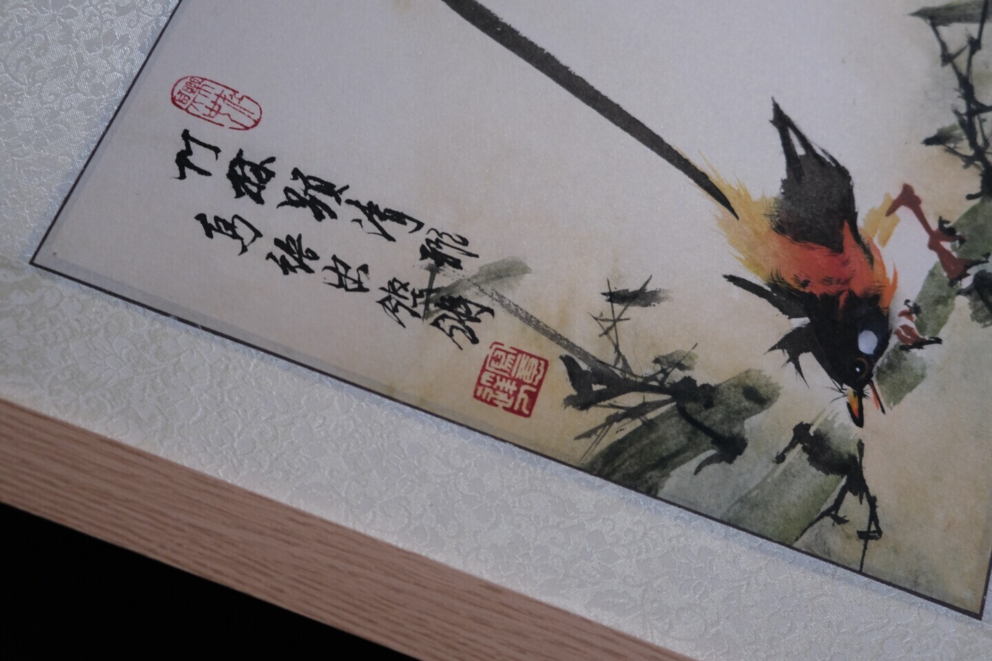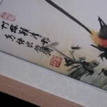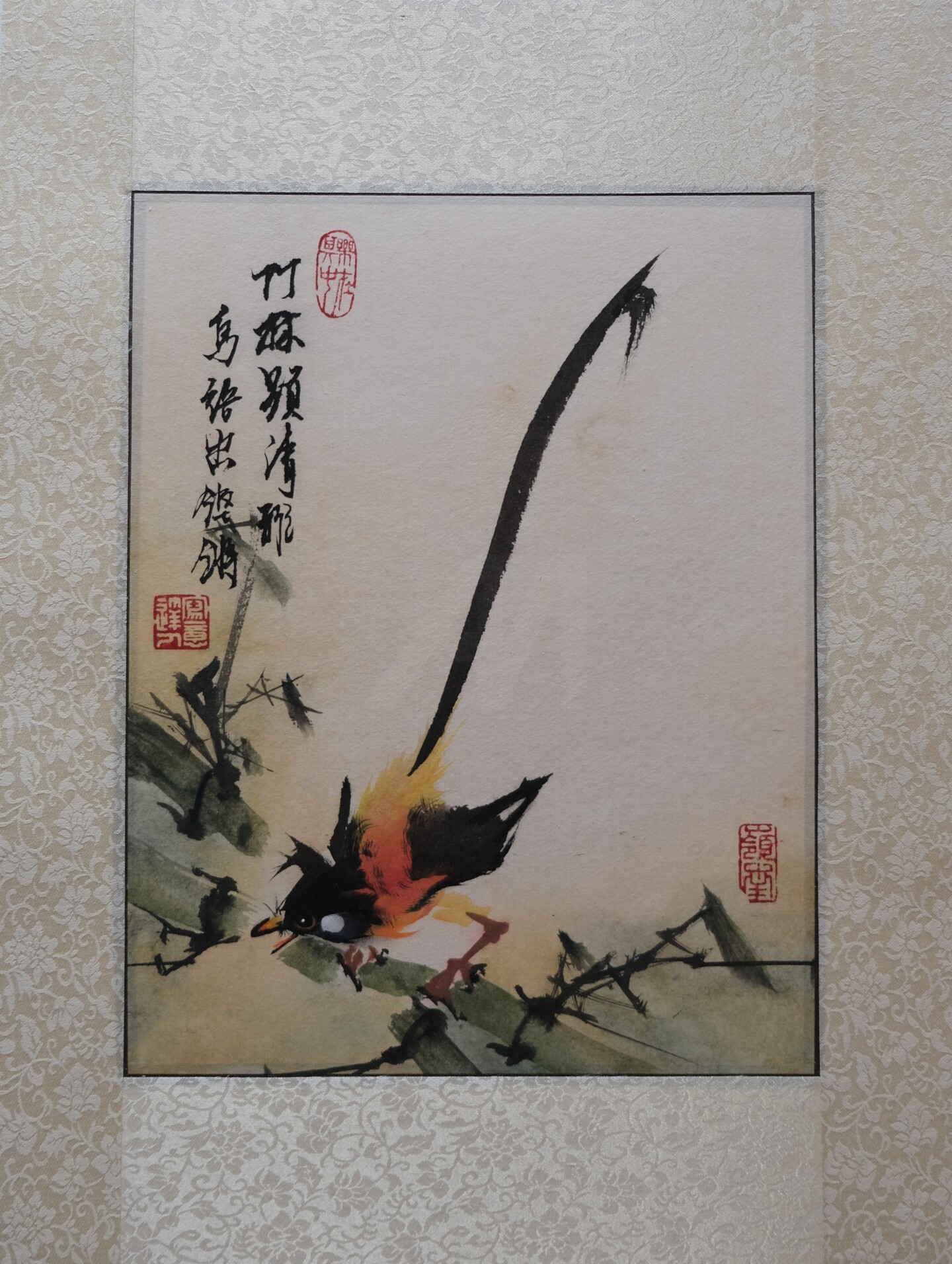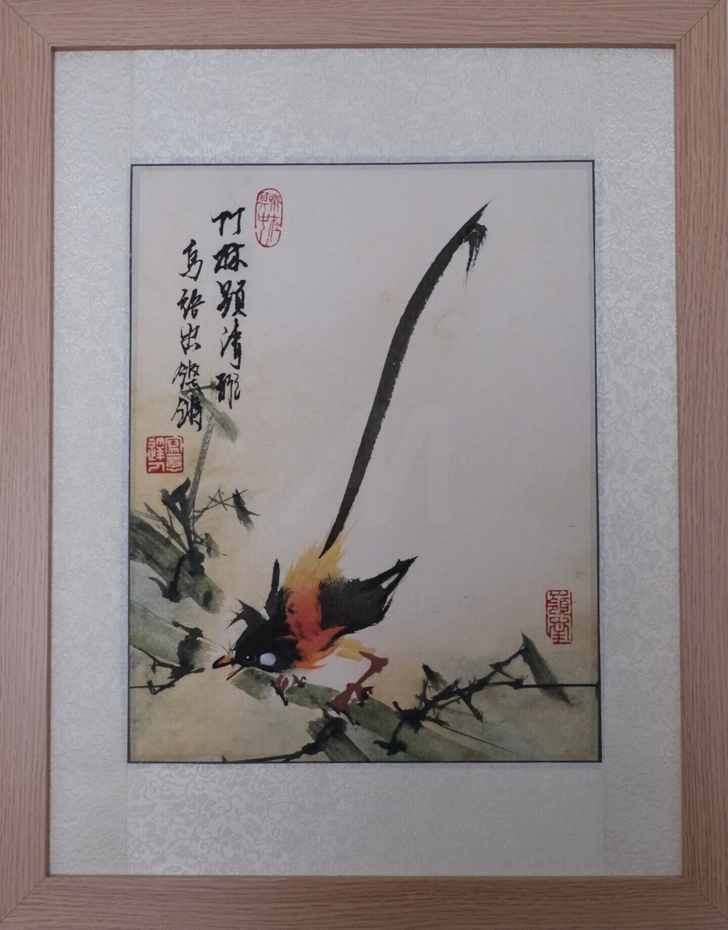 The poem inscribed within the painting: “Bamboo grove exudes pure grace, Birdsong rings with vibrant pace.”